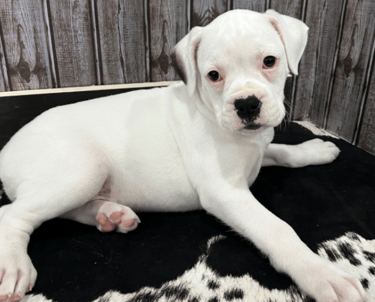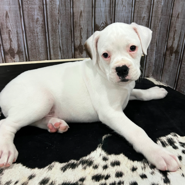 Hello there! My name is Snow and I want you to pick me! I love to snuggle and be as cute as can be! My parents said I'm perfectly healthy and up to date on my puppy vaccinations. Being loved makes me happy and all I want is a nice family to take care of me. I love to play and to take long naps. If I'm chosen to join your family, I'll be the best puppy you could ever ask for; I promise! Make the call now and find out how to bring me home! White boxer puppies for sale