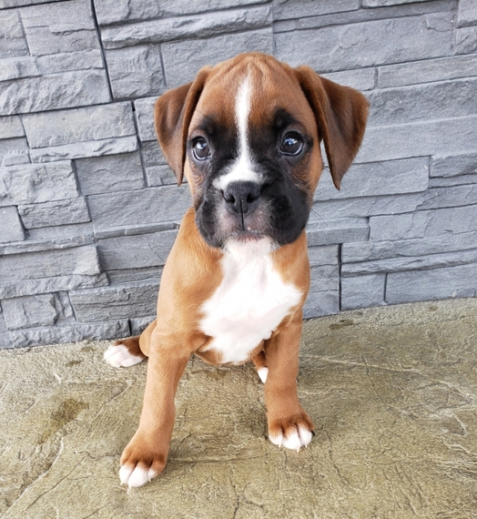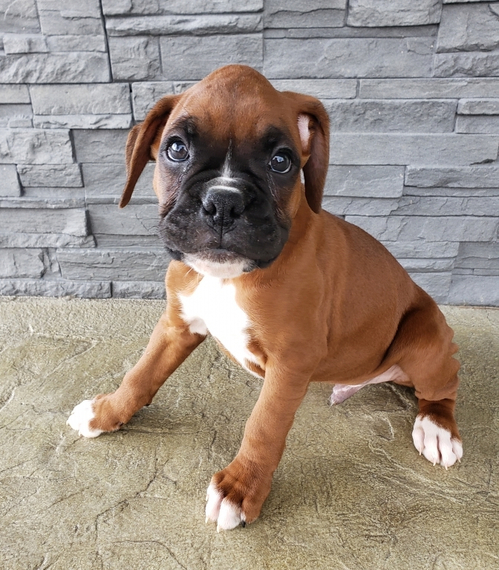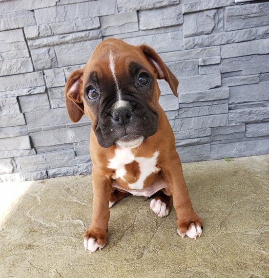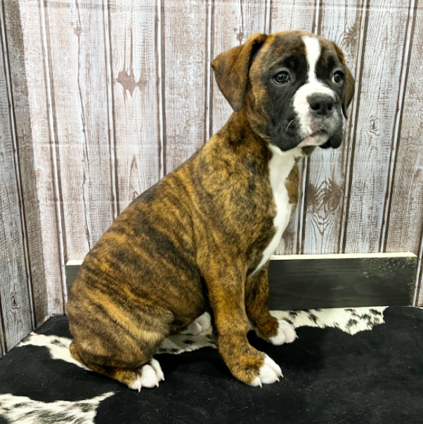 Hello! It's very nice to meet you. Are you looking for a lifelong companion? Look no further. I am here and just perfect for you. Trust me! I am very loyal, and I can make you smile with just the way I wag my tail. I have a wonderful disposition. Oh! Did I mention that I'm as healthy as can be? Oh, silly me! I'm up to date on my vaccinations and vet checked from head to tail. I bet you are excited now, aren't you? Well, choose me today! Boxer puppies for sale